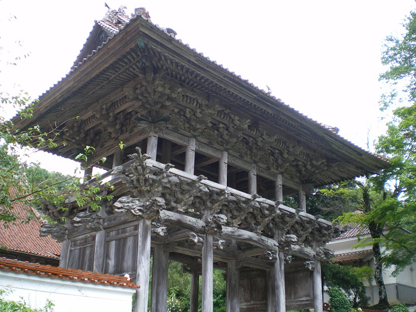 総ヒノキ造りの楼門は彫刻が見事。6頭の竜、4対の獅子、鶴や雲、花、極楽鳥などが彫られている。
