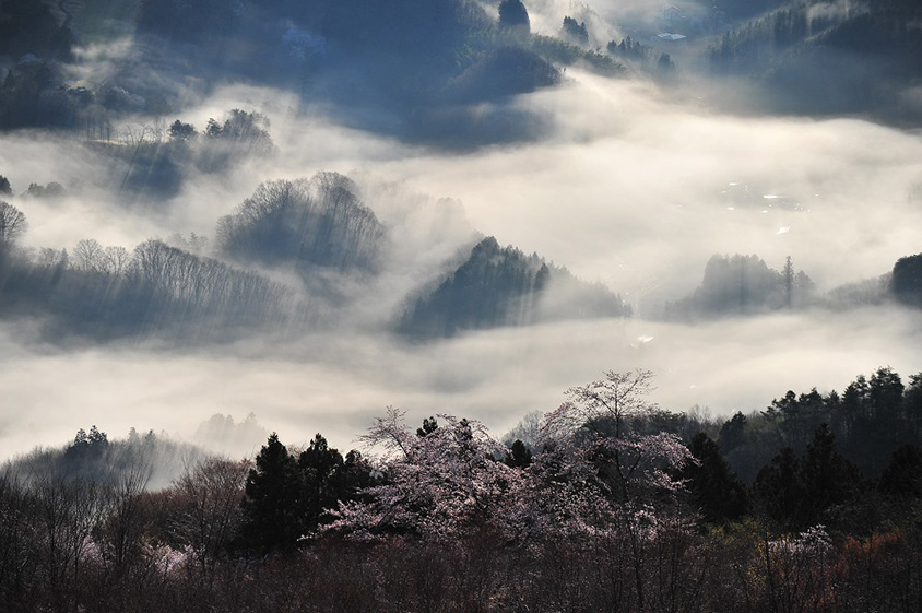 雲海とサクラが一度に見られることも。4月の早朝、無風状態で湿度が高く晴れた日がチャンス。雨が降った日の翌日なら尚よい。