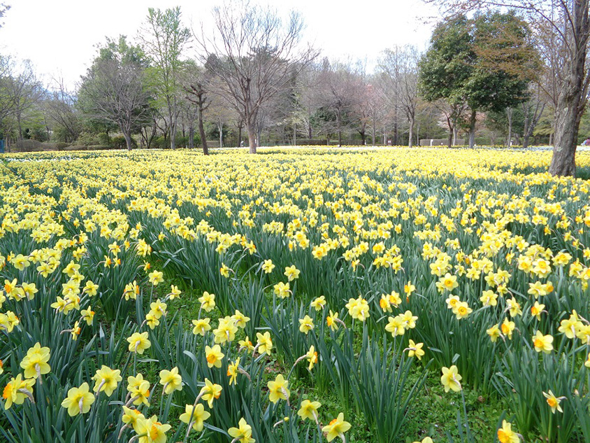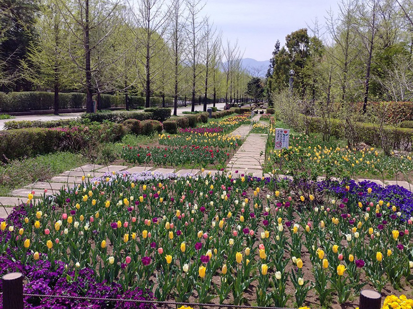 美の山公園から車で約25分の「秩父ミューズパーク」も、4月いっぱいは春の花が見頃。園内中央を南北に貫くスカイロード沿いをはじめ至るところで咲いているサクラのほか、南口に近い林間広場付近のスイセン広場では、スイセンの群生の中に敷かれた小路を歩いて花畑の散策を楽しめる。軽飲食堂ピエリアのあるステンドハウス南側では、色とりどりのチューリップが美しい。