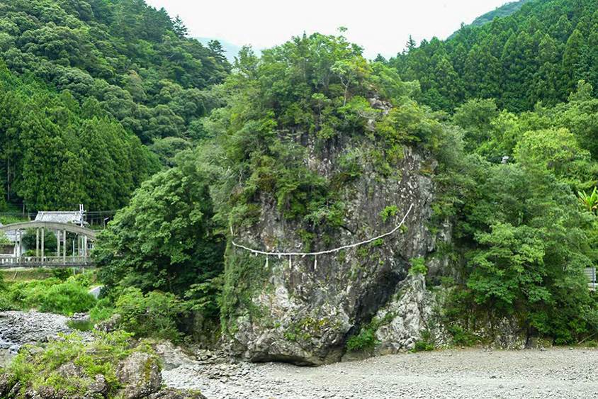 次の滝から車で約20分の「粟生の巌(あおのいわお)」は、高さ25m、基底部の周囲100mという巨大な岩。有田川と四村川(よむらがわ)の合流地点にあり、国道480号からも見ることができる。古来より信仰の対象であったと考えられており、現在でも地域のシンボル的存在だ。ここから徒歩約1分、粟生の巌を見下ろす場所に立つ岩倉神社は粟生の巌を御神体とする神社。合わせてお参りしたい。
