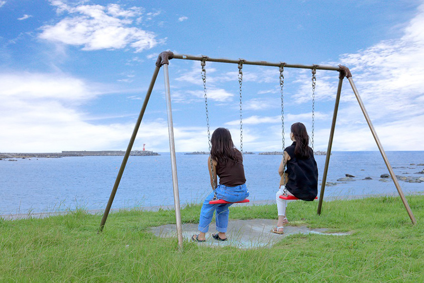 海に向かって漕ぐ「星結いのベンチ」。このブランコはどこにあるのかとSNSで話題になった。