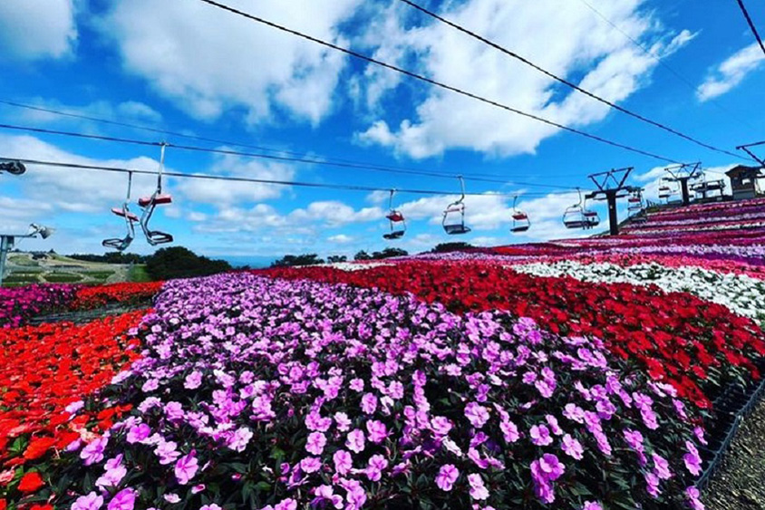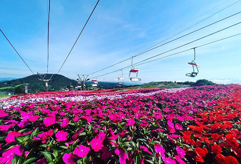 「茶臼山高原」の萩太郎山にある茶臼山高原スキー場では、スキーシーズン前の夏から秋にかけて、サンパチェンスの花が見頃を迎えている。6月からリフト下に植えられたサンパチェンスは8月に入って咲き始め、霜がおりる10月中旬~11月上旬頃まで咲いているという。赤や白、紫とカラフルに咲く花の上で、リフトに乗って片道約15分の空中散歩を楽しもう。2022年は山頂付近のリフト下約200mの区間に、約12000株が植栽されている。リフトで到着する萩太郎山山頂にある「スカイガーデン」は、ビュースポットとして人気。