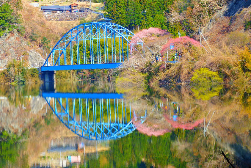 「豊根大橋」は、茶臼山高原から車で約35分の新豊根ダムのダム湖(みどり湖)に架かる青い橋。晴れた風のない日には、きれいな青いアーチが鏡のような湖面に映り、絵のような美しい光景を見ることができる。