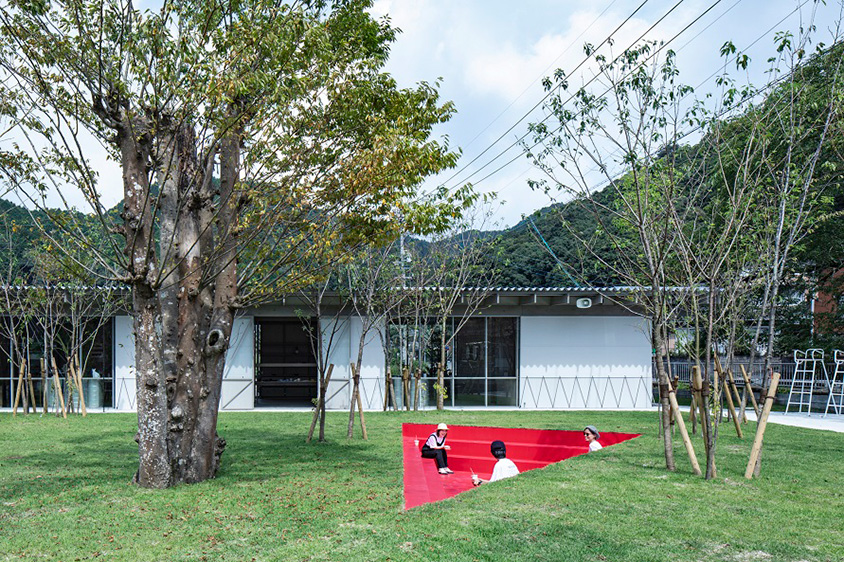 芝生が敷かれた園内には、談笑できるスポット「さんかくのだんだんへこみ」。