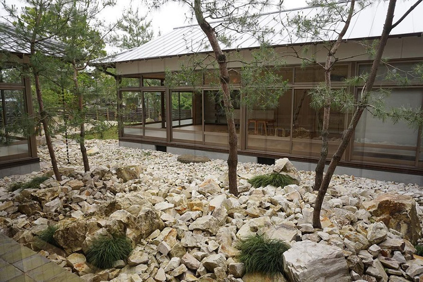 波佐見焼の原料として使われてきた陶石や、松の木が配された中庭。