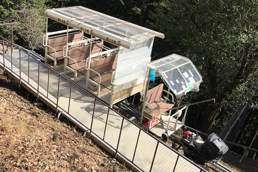保存修理工事の際に、資材や作業員を運搬したモノレール。今は観光客を山上の「小林家住宅」まで連れて行ってくれる。