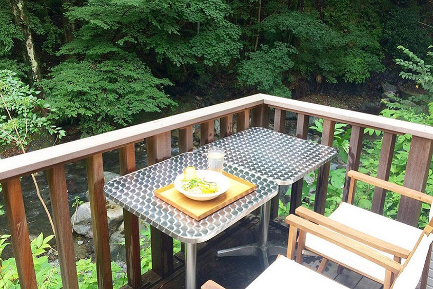 渓流を望むテラス席。緑と風を感じながら食事やお茶を楽しめる。
