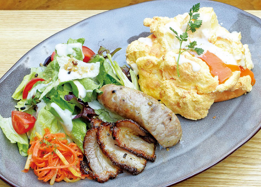 平日11時30分~14時30分限定の「お食事パンケーキ」1450円(税込)。ハーフパンケーキにサラダ、岩手県産四匠豚のサルシッチャ、自家製パンチェッタに温泉卵が添えられている。