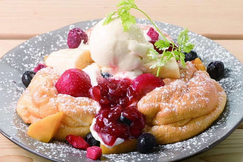 「贅沢果実のふわふわスフレパンケーキ」(通年メニュー)1350円(税込)。