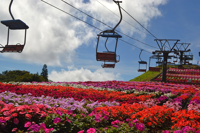 緑地広場と山頂付近を結ぶ観光リフト。リフト下に咲いているのは、シバザクラが見頃を終えると咲き始めるサンパチェンス。