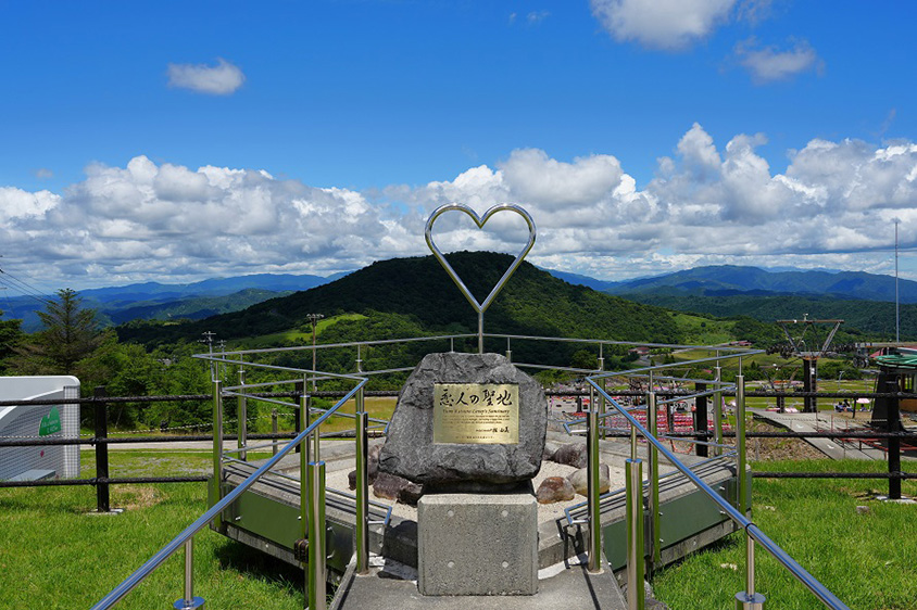 恋人の聖地に認定された茶臼山高原。モニュメント「砂の泉」にローズクォーツ(「レストハウスやはず」や総合案内所、リフト山頂で購入できる願いが叶う天然石(1袋400円))を投げ入れると、願いが叶うといわれている。