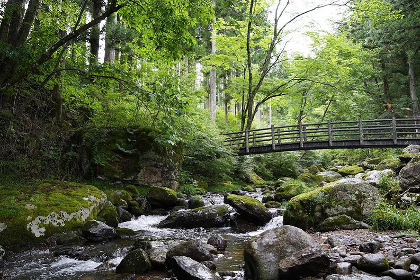 森の中を流れる赤芝川の渓流では川遊びもできる。