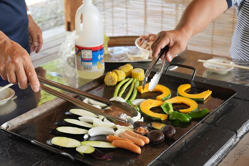 野菜、肉、ご飯、味噌汁付きの「炭焼きバーベキュー」は、要予約。自然の中でのバーベキューは格別。
