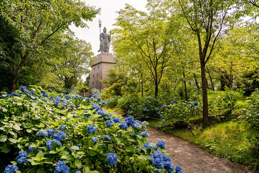四国霊場第66番札所「雲辺寺(うんぺんじ)」は、標高911mと四国霊場では最も高い場所にあり「雲の上の名刹(めいさつ)」と呼ばれる寺。標高が高いため平地より気温が低く、例年8月中旬頃までアジサイを楽しめるという。アジサイの数はおよそ3万株あり、毘沙門天像まで続く参道脇や境内に安置された五百羅漢像を背に、ブルーやピンクのアジサイが咲き誇り、目を楽しませてくれる。山頂にある雲辺寺へは、毎秒10mで運行する雲辺寺ロープウェイに乗って行くことができる。