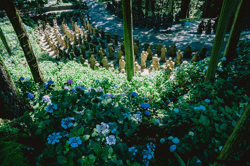 五百羅漢像を囲むように、見事なアジサイが咲く。