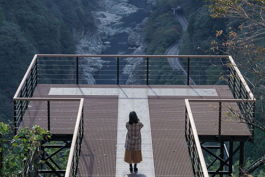 2022年にできた展望台。国道32号線から県道271号線を「とびの巣峡」方面に入り、700mほど進んで「小歩危展望台」の看板に沿って右折、細い道を上がると右側に展望台、すぐ先の左側に駐車場がある。