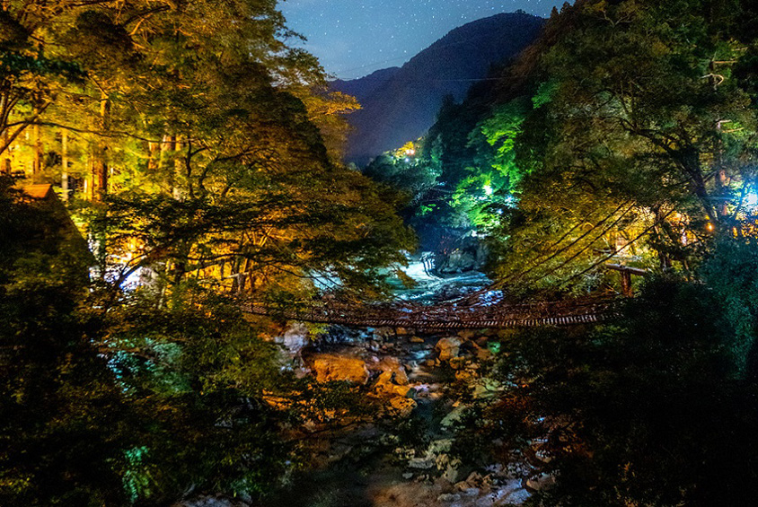 ライトアップされ闇夜の中に照らされた「かずら橋」が幻想的。
