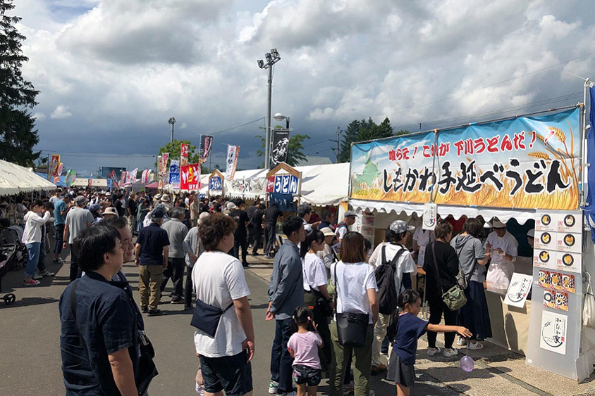 道内有数の小麦の産地でもある下川町。町内には6軒の製麺工場があり、下川町産ハルユタカ小麦を100%使った「雪の華舞」や、北海道産小麦をブレンドした北海道産100%「奥蝦夷白雪」といったブランドが有名。しもかわうどん祭りは「万里長城祭」「アイスキャンドルミュージアム」とともに、下川町3大イベントのひとつ。