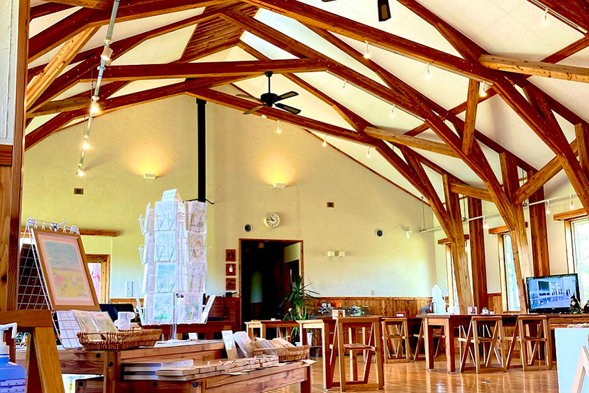大きな窓から日差しが降り注ぐ、明るい館内。音響効果抜群の樹状トラス構造で、ライブ会場に利用されることも。