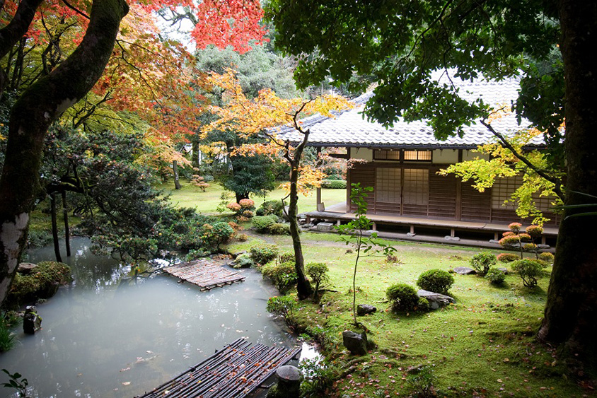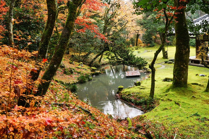鶏足寺から車で約20分の「近江孤篷庵(おうみこほうあん)」も、美しい紅葉で知られる寺。明治維新以降無住であった小室城主小堀遠州(こぼりえんしゅう、1579~1647年)の菩提寺を、1965年に小堀定泰(こぼりじょうたい)が再建。茶人であった遠州が好んだ庭園も整備された。枯山水と池泉回遊式の庭園は県の名勝に指定され、近江八景を模したといわれる趣のある造りだ。