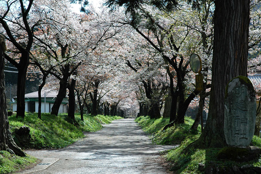 「明建(みょうけん)神社」は鎌倉時代から室町時代の終わりにかけて、現在の郡上市大和町を治めた東氏(とうし)が建立した神社。サクラの名所としても知られ、横参道脇に続くソメイヨシノやヤマザクラのサクラがほぼ一斉に咲き揃い、「飛騨・美濃さくら33選」に選出された。大小100本余のサクラが250mにわたって連なる、サクラのトンネルは圧巻だ。一帯の神社の森は県の天然記念物に指定されている。