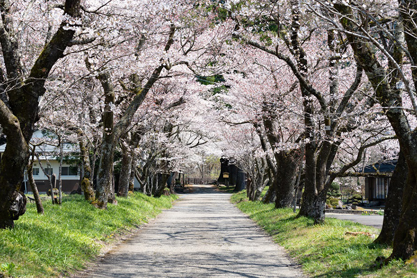 明建神社から車で約25分の「国道156号線の桜並木」(top画像)は、「桜街道」とも呼ばれドライバーに親しまれるサクラスポット。国道156号線沿いにソメイヨシノの並木が約500m続き、薄紅のソメイヨシノが咲く中を車で走れば、春の陽気を感じられそうだ。見頃は例年4月上旬だが、年々早まる傾向にあり、2023年は3月27日に満開となった。