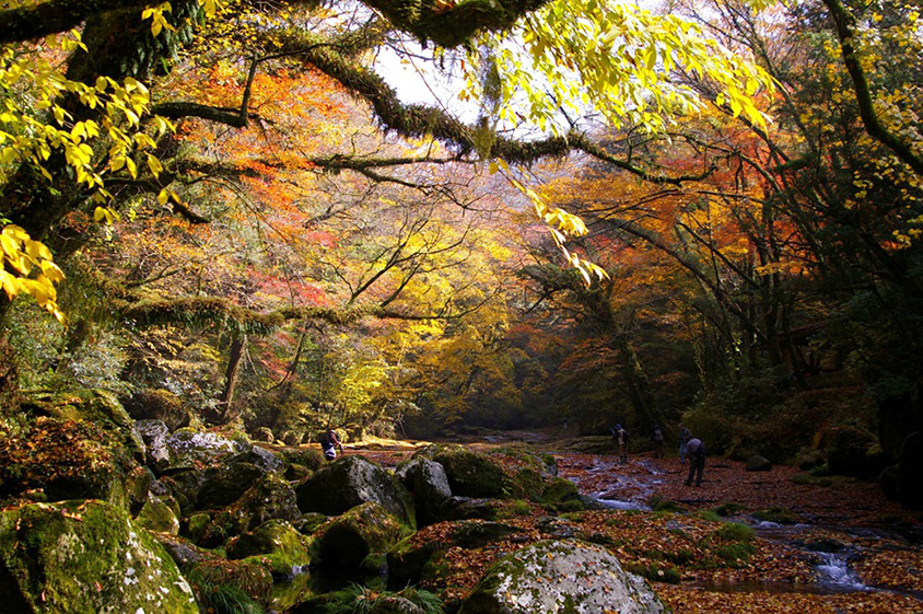 「菊池渓谷」は、阿蘇外輪山の北西部から有明海へと注ぐ県北最大の河川、菊池川の源流。かつては「菊池水源」と呼ばれていた。多くの滝や瀬が点在する変化に富んだ渓流を鬱蒼とした広葉樹が縁取り、自然美豊かな景観をなす。澄んだ空気と清冽な水流は「天然のクーラー」と呼ばれるほど。新緑や紅葉の季節は特に素晴らしく、その眺めに心癒やされること請け合いだ。渓流散策の前後は「菊池渓谷ビジターセンター」で休憩や飲食が可能。渓谷側は一面ガラス張りで、館内から渓谷美を一望できる。