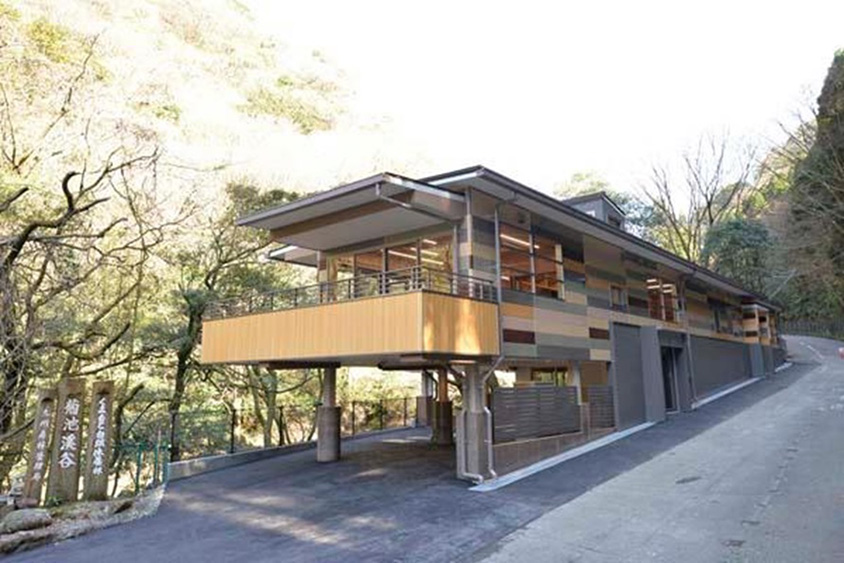 菊池渓谷を眺望する位置に建つ「菊池渓谷ビジターセンター」は、渓谷散策の拠点。