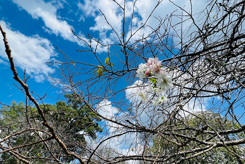 菊池渓谷から車で約20分の「菊池公園」は、ゆかりの文豪の文学碑や観月楼(展望台)がある、市民におなじみの公園。春には約3000本が咲くサクラの名所だが、秋もサクラを楽しめる。春と秋の2回咲く「十月桜(じゅうがつざくら)」がそれ。公園内の第二駐車場に植えられた十月桜は約70本あり、早ければ9月中旬から咲き始め、春とはまた違った風情のサクラを楽しめる。花は春のサクラより少し小さく、白色に淡紅色が混じった八重咲きがぼってりとして愛らしい。
