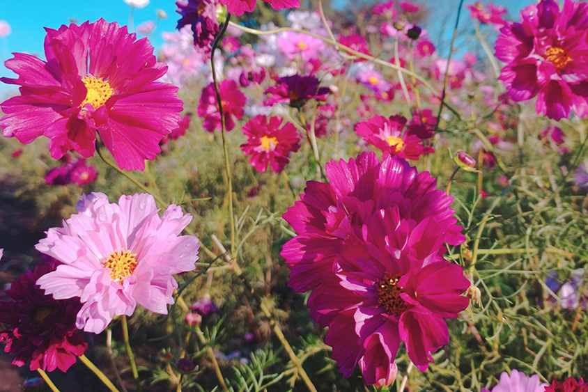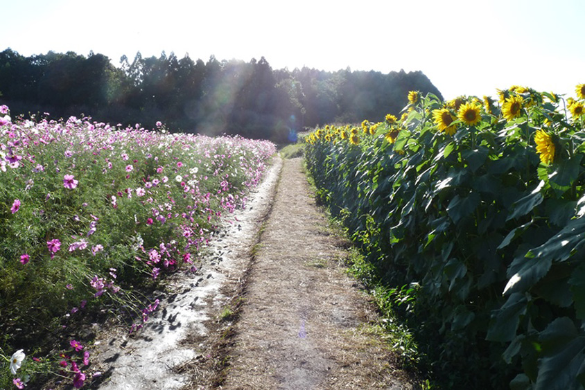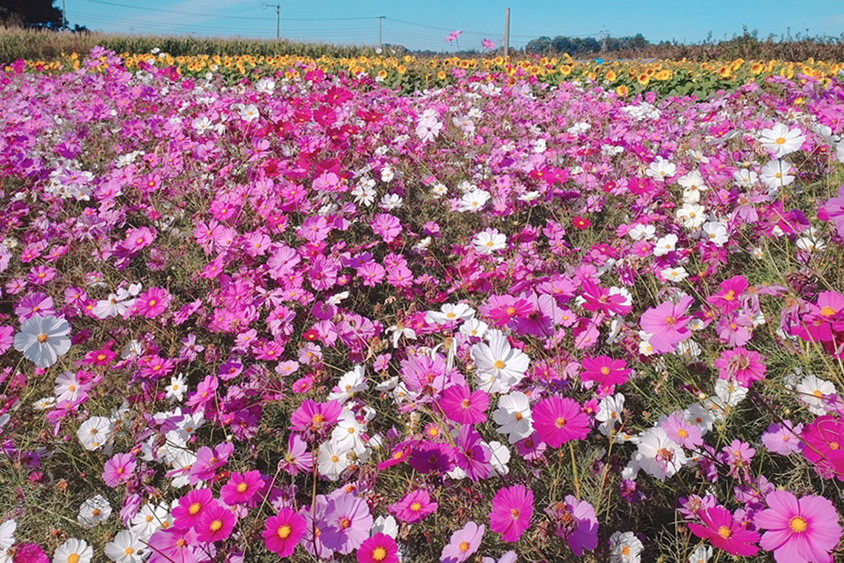 コスモスだけでなく、ヒマワリも合わせて見られると人気の花畑。