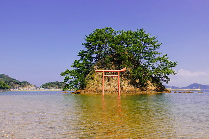 赤い鳥居が建つ「夢の小夜島」。水深が浅く、潮が引くと歩いて渡ることができる。