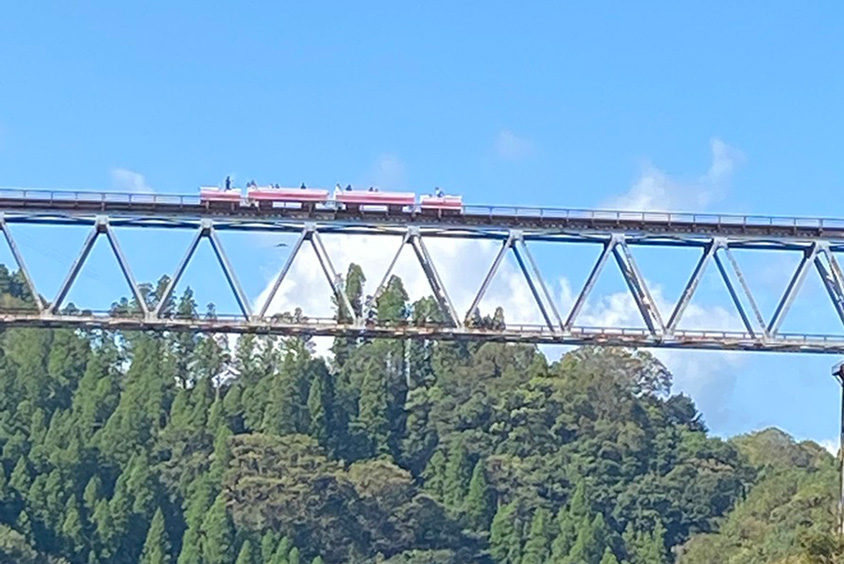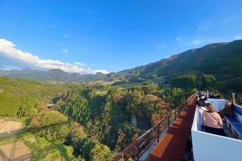 高千穂鉄橋を走るスーパーカート。足元の強化ガラスからも、高さを実感。