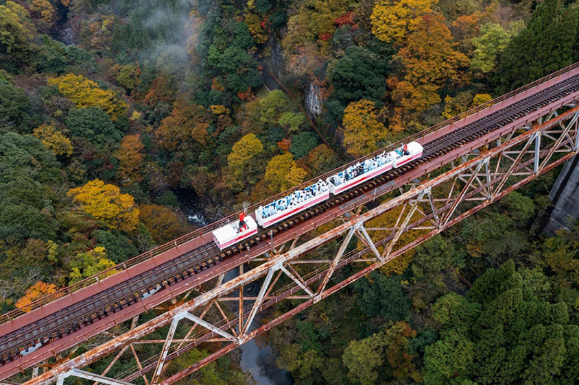 「高千穂あまてらす鉄道」は、高千穂駅から高千穂橋梁まで、往復約5キロメートルをオープントップのグランドスーパーカートで走り抜ける大人気アトラクション。2005年の台風で被災し、後に廃線を余儀なくされた旧高千穂鉄道の線路を約30分で運行する。最高地点105メートルの高千穂橋梁からは、思わず歓声をあげたくなる大峡谷や高千穂の山々の絶景が広がる。客車の床には強化ガラスがはめ込まれ、はるか下の眺めに足がすくんでしまいそう。線路上に2ヵ所あるトンネルはイルミネーションに彩られ、変化に富んだ列車旅を楽しめる。