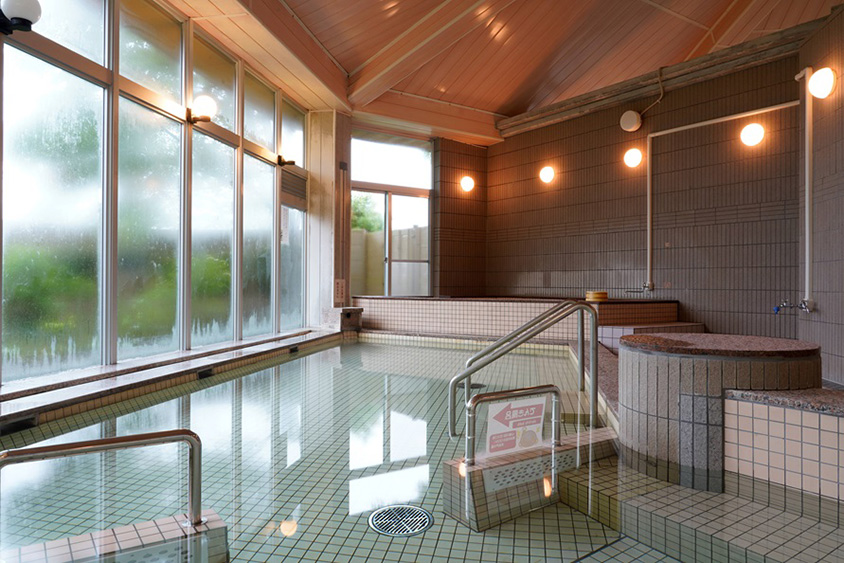 高千穂町営の日帰り温浴施設。大きな窓から陽光が差し込む明るい大浴場、サウナにも窓があり、入浴後にくつろげる休憩室がある。