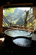 原生林と清流の織りなす景観が心を洗う景勝地・九酔渓を見渡す地にある、日帰り利用と宿泊も可能な貸切専用温泉入浴施設。檜風呂や大木をふんだんにあしらった風呂、釜風呂、桶風呂など、趣向が異なる貸切風呂が9つあり、休憩用の個室なども付く。湯は飲用が可能。素泊まりも可能で1室6000円(2名利用)からとエコノミー。サウナ・電気風呂付きの大浴場も日帰りで利用できる。