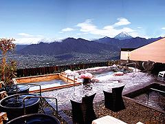 美しい宝石露天風呂に浸かれば、昼は富士山と甲府盆地の大パノラマ、夜は新日本三大夜景が楽しめる日帰り湯。季節ごとのフルーツ風呂も楽しみだ。