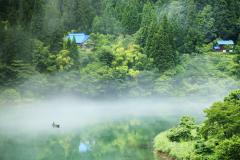 金山町と三島町の町境にある渓谷が、夏の朝夕に漂う川霧に包まれ、幻想的な光景を見せることから名づけられた「霧幻峡」。春から秋にかけて只見川を就航する和船から、その絶景を楽しめる。夏は新緑が眩しい清々しい空間が広がり、秋には一帯が山々の紅葉に包まれて、水面に映る錦秋の風景が堪能できる。