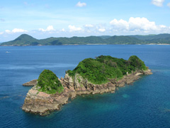 世界文化遺産「長崎と天草地方の潜伏キリシタン関連遺産」の構成資産の1つ。平戸島北西岸の沖合2km、生月島と平戸の間に位置する中江ノ島は、東西約400m、南北約50m、標高約35mの無人島。禁教初期の元和8年(1622)に、平戸藩によって田平で処刑されたカミロ神父の布教を助けたヨハネ(ジュワン)坂本左衛門ら4人のキリシタンの処刑が、2年後には家族もこの島で処刑された。平戸地方の潜伏キリシタンは、殉教地である島を「サンジュワン様」と呼び、死者の顔も島に向けて埋葬するなど、聖地として拝んだ。「サンジュワン」は、キリストに洗礼を授けた聖人・洗者ヨハネのポルトガル語読み。洗礼や家の祓い、病気直しのため聖水は、この島の岩間からしみ出す水を採取したもので、「お水取り」の儀式を行って得たもの。島への上陸は不可で、見学は生月島のクルスの丘公園からがおすすめだ。