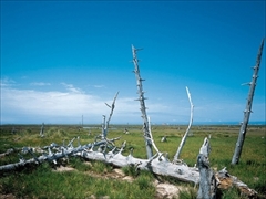 野付半島ネイチャーセンターの建物裏手から歩いて約30分程で広がるトドワラ。トドマツが海水の浸食と潮風によって朽ち、荒涼とした風景が展開する景勝スポットとなっている。以前は立ち枯れた木が立ち並ぶ様が見られたが、現在は大半が風化のため倒木、その中の木道を散策できる。一方、野付半島のほぼ中央には、ミズナラが立ち枯れた「ナラワラ」もある。トドワラ往復ツアー2名~、大人3000円、子供半額(料金変更の場合あり、要確認)。ネイチャーセンターでガイドを頼むのもおすすめ。5~10月ならトラクターバスも運行(有料)。