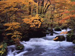 奥入瀬渓流一の急流が阿修羅の流れであり、たくさんの岩がある場所が九十九島と呼ばれる。