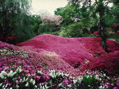 秋間梅林のすぐ西にある、自然の地形を生かした花の園。1万5000坪の敷地には四季折々の花が咲く。12月の寒い時期から咲き出す寒紅梅から始まり、20万本のスイセン、3万本のクルメつつじなど、5月末まで様々な花を楽しめる。