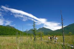 標高1400mの高地に広がる日本を代表する高層湿原。戦場ヶ原の名は、男体山の神と赤城山の神が争った「戦場」だったという伝説に由来する。湿原にはさまざまな動植物が生息し、夏はとくに高山植物が美しい。一帯は初夏のズミの開花を皮切りに、レンゲツツジ、ホザキシモツケ、ニッコウアザミ、ノハナショウブなど多くの高山植物が咲きそろうほか、ワタスゲなどの湿原植物が咲く。秋には草原一帯が赤や黄に染まる。ハイキングコースも整備されている。