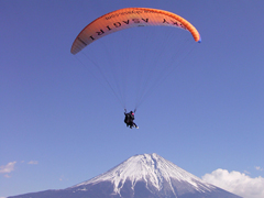 富士山を目の前にパラグライダーやカヌーができるスクール。パラグライダーは、自分の力で丘からフワッと飛ぶ体験コース10000円と300mの高さからインストラクターと飛ぶタンデムコース10000円~がある。カヌーは、1000円札の裏に描かれている本栖湖で体験できる。初心者向けの艇を使うのでリラックスして漕げる。家族にも人気(1名6000円)。