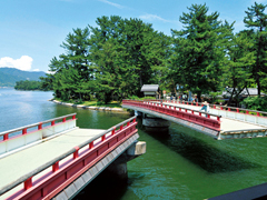 文珠地区と天橋立を結ぶ廻旋橋。多い日には50回以上、船が通るたびに中央から橋が90度旋回する。以前は人力で動かしていたが、現在は電動式。5分ほどかけて、ゆっくり船をやりすごす様は情緒的だ。日曜日には船が通行しなくても旋回する(11~15時。11時、12時、13時、14時、15時※1時間に一回)。