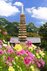 629年、高句麗の僧慧灌が、この地に文殊菩薩像を安置したことを起源とする寺で、その後天平7年(735年)聖武天皇の時、堂塔が造営されたと伝わる。春は山吹、秋はコスモスが咲き誇る花の寺としても有名。鎌倉期の建築様式をもつ楼門は国宝、楼門の奥正面にある十三重石塔は国の重要文化財に指定されている。