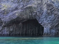 海面から高さ40mの断崖に7つの巨大な洞窟が並んでいる海食空洞。長い歳月をかけて、玄界灘の荒波によって形成された。最も大きなもので間口3m、奥行110mほど。遊歩道を歩いていくと、玄武岩の柱状節理[ちゅうじょうせつり]とともに、東松浦半島の雄大な絶景を一望できる。国の天然記念物に指定されている。