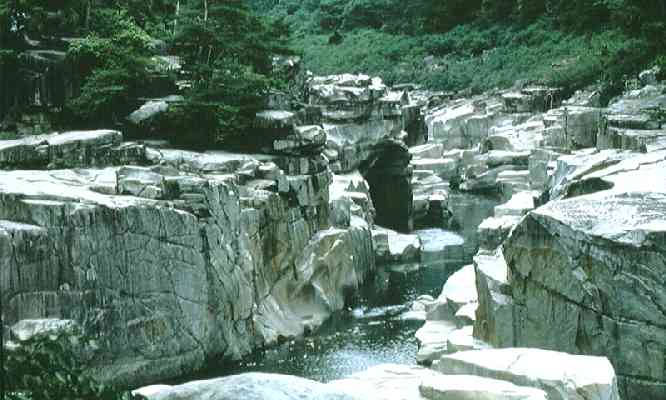 木曽川べりの横たわる巨岩 川の瀬に洗われた花崗岩の奇岩。ここを見下ろす高台に浮世絵で有名な木曽路美術館がある。