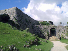 中城湾を望む標高160mの高台にある世界文化遺産の名城跡。沖縄県内に300余りが残されているグスクの中でも特に美しい遺構が残っており、国の史跡に指定されている。先中城按司が築いた城を15世紀中頃、築城家でもある座喜味城主の護佐丸[ごさまる]が国王の命令により移り住み、三の郭と北の郭を増築・完成させたといわれている。6つの城郭からなる連郭式の城は、琉球石灰岩の切石を基本に自然の岩石、地形的条件を生かした石垣が城壁を囲む。築城年代が違うため、切石積みの技法も野面積みと布積み、亀甲乱れ積みの3つの技法が見られる。
