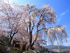 高遠さくらホテル南側の小高い場所に建つお堂。境内には樹齢140年と推定される大きな枝垂れ桜があり、勝間の里に春の訪れを告げる。老桜が3本並び、枝が風に揺らめく様は幻想的だ。遠景もみごと。