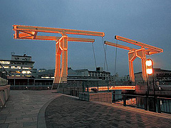 ハーバーランドのカルメニ(神戸情報文化ビル)南側にあるイベント広場のはねっこ広場。その中央に架かる歩行者専用の平行四辺形式跳開橋。平成2年(1990)に架けられたはね橋で、周囲に石畳の階段状ベンチが広がる。夜には橋に取り付けられた1700球のイルミネーションが灯り、ロマンチックな雰囲気に。